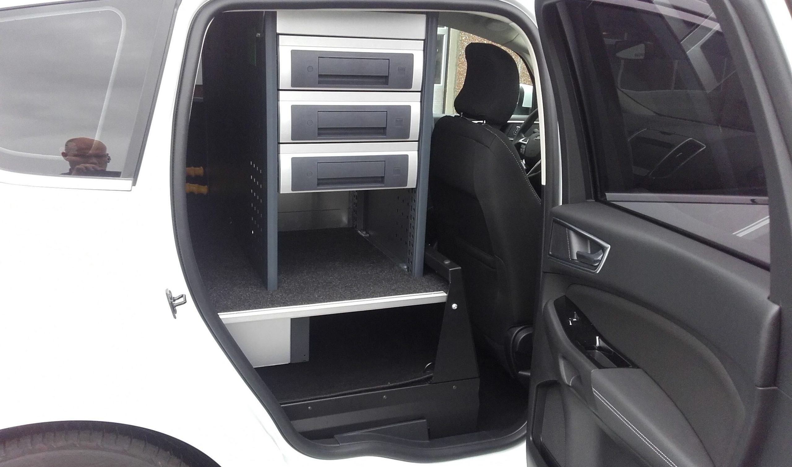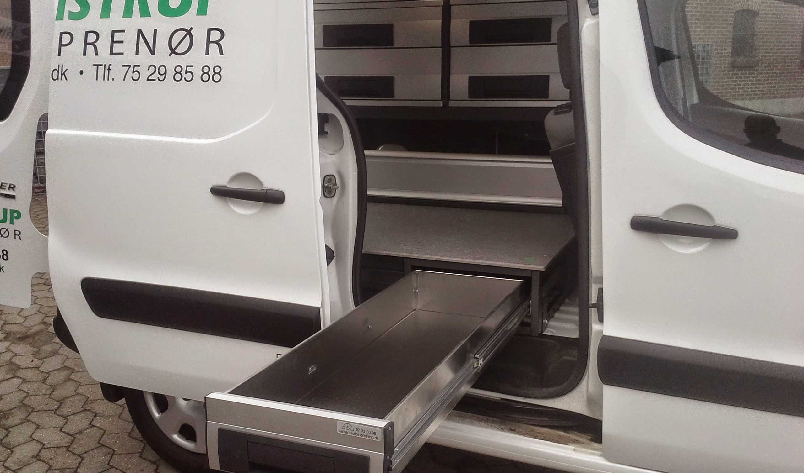 Hylder indrettet til eksempelvis dunke. Borde til det mobileværksted med eksempelvis et skruestik. Borde kan leveres opklappelig, således materialebearbejdningen foregår udenfor bilen.